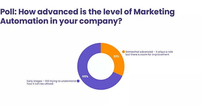 Our second poll in the webinar asked the audience to rate how advanced they would perceive the level of marketing automation in their company to be. This poll revealed that only 32% had felt that their company was ‘somewhat advanced’, with the remaining 68% indicating that they were very much still in the early stages of implementing it. Nobody felt that the level of marketing automation in their company was at an advanced stage.